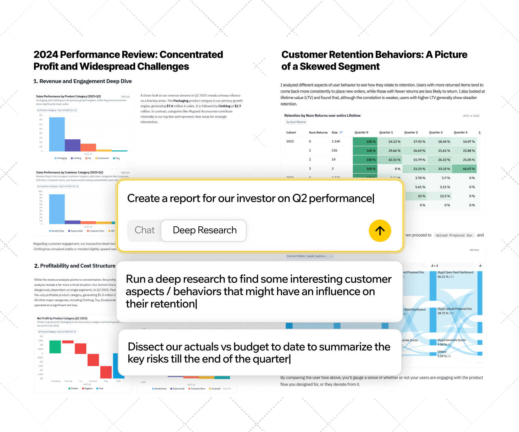 A living document where writing and analysis sit side by side, while BI widgets update in real-time as data refreshes.